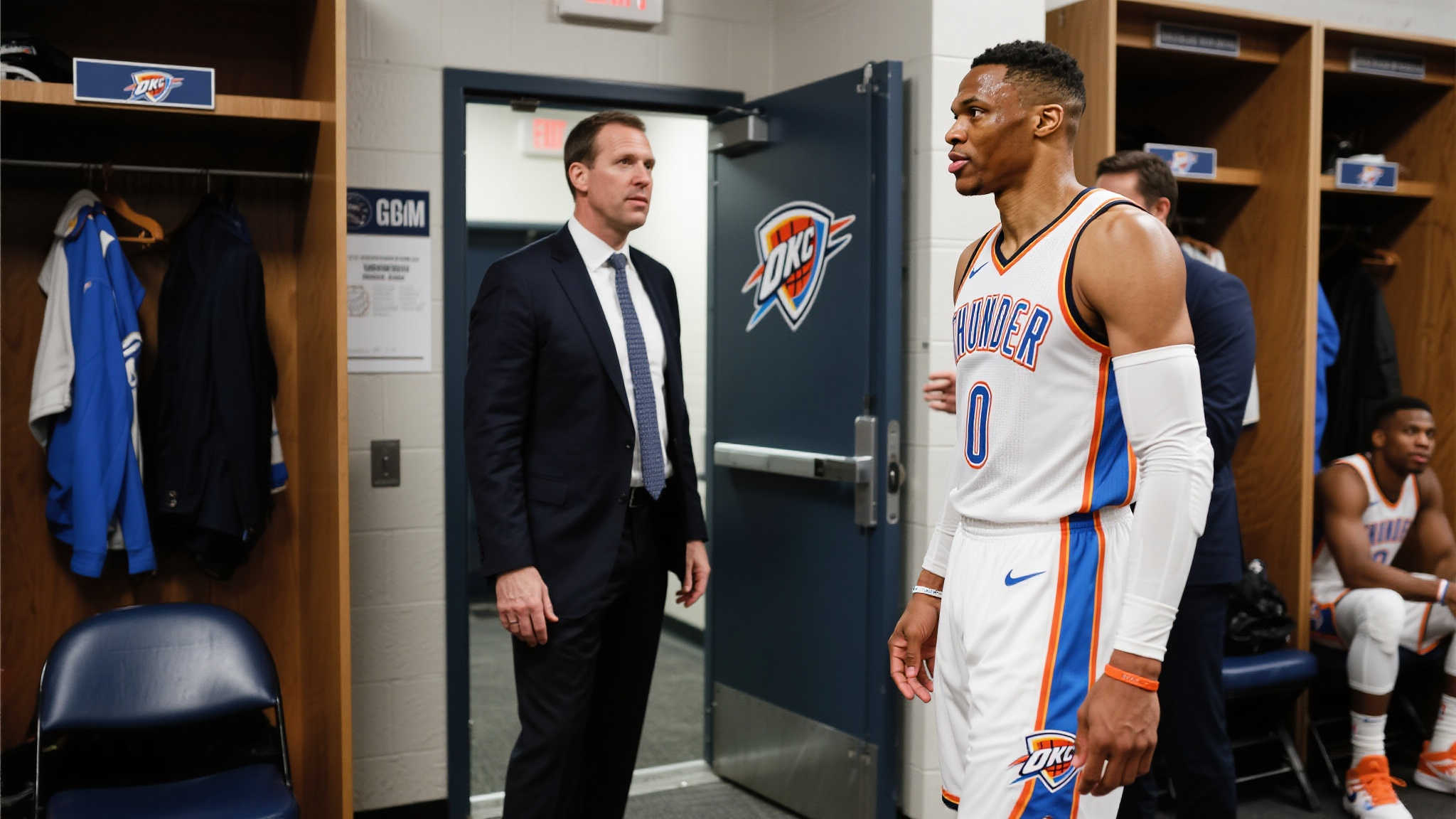 赛后雷霆GM普雷斯蒂更衣室外与威少热情拥抱,畅谈欢笑